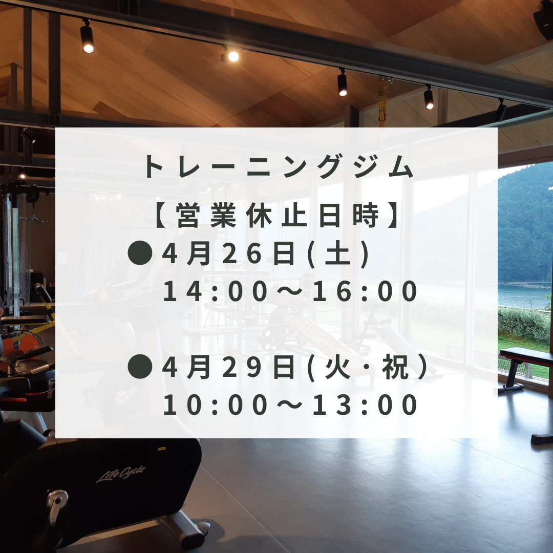 トレーニングジム営業休止のお知らせ【4/26(土)、4/29(火・祝)】